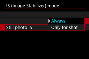 Stabilizácia obrazu vo fotoaparáte eliminuje otrasy fotoaparátu pri snímaní statických záberov. V prípade objektívov bez stabilizácie obrazu nastavte položku [IS mode/Režim IS] na možnosť [On/Zap.] nasledujúcim spôsobom pri používaní. S objektívmi so stabilizáciou obrazu sa otrasy fotoaparátu redukujú pomocou stabilizácie vo fotoaparáte aj objektíve. Keď používate objektívy so stabilizáciou obrazu, ktoré nemajú prepínač stabilizácie obrazu, nastavte položku [IS mode/Režim IS] na možnosť [On/Zap.]. Upozorňujeme, že pre objektívy IS s prepínačom stabilizácie obrazu je nastavenie [IS mode/Režim IS] sivé. V takom prípade sa pri prepnutí prepínača stabilizácie obrazu v objektíve do polohy kombinuje stabilizácia vo fotoaparáte a objektíve.