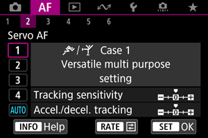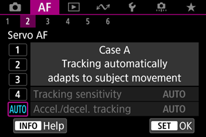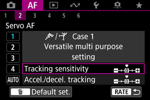 Parametre ((1) Citlivosť sledovania AF a (2) Sledovanie zrýchlenia/spomalenia) môžete manuálne upraviť pre scenáre Case 1 až Case 4.