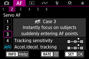 Snímanie s režimom AF-Servo sa dá ľahko prispôsobiť vašim objektom alebo situáciám snímania výberom možnosti Case *. Táto funkcia sa označuje ako „nástroj na konfiguráciu AF“.