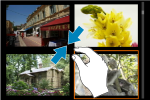 Fotoaparát je vybavený panelom dotykovej obrazovky, na ktorej môžete dotykom ovládať prehrávanie. Podporované dotykové funkcie sú podobné funkciám používaným so smartfónmi a podobnými zariadeniami. Najskôr stlačením tlačidla pripravte ovládanie prehrávania dotykom.