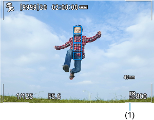 Predvolene je položka [Automatické zaostrovanie: AF area/Automatické zaostrovanie: Oblasť AF] nastavená na možnosť [Whole area AF/Celá oblasť AF]. Po stlačení tlačidla spúšte do polovice sa zobrazia rámy oblasti AF (1). Po zaostrení na objekt sa farba bodu AF zmení na modrú.