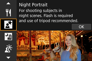 Režim [] (Night Portrait/Nočný portrét) použite na jasné, krásne zábery osôb s nočnými scénami v pozadí. Upozorňujeme, že na snímanie v tomto režime sa vyžaduje externá záblesková jednotka. Odporúča sa používať statív.