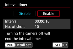 - Snímanie s intervalovým časovačom sa zruší a obnoví na možnosť [Disable/Zakázať], ak nastavíte vypínač do polohy