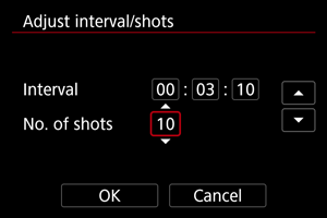 - Ak nasledujúci naplánovaný záber pomocou intervalového časovača nie je možný, pretože fotoaparát sníma alebo spracúva snímky, vynechá sa. Preto sa zhotoví menší počet záberov, než ste zadali.