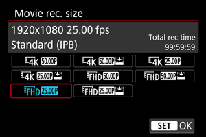 Môžete nastaviť veľkosť snímky, snímkovú frekvenciu a spôsob kompresie v položke [: Movie rec. size/