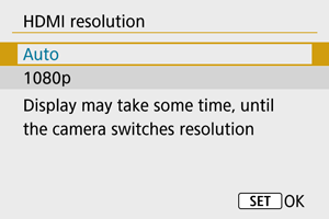 Nastavte rozlíšenie obrazového výstupu, ktoré sa používa, keď je fotoaparát pripojený k televízoru alebo externému záznamovému zariadeniu pomocou kábla HDMI.