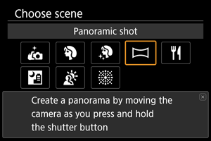 Režim [] (Panoramic shot/Panoramatická snímka) sa používa na snímanie panorám. Panoráma sa vytvára skombinovaním záberov zhotovených v sériovom snímaní pri pohybe videokamery jedným smerom pri úplnom stlačení tlačidla spúšte.