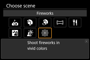 Na snímanie ohňostrojov v živých farbách použite režim [] (Fireworks/Ohňostroj).