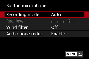 - Tlmenie funguje automaticky pri použití zabudovaného mikrofónu alebo externého mikrofónu. Nastavenia možno zmeniť pri použití externého mikrofónu kompatibilného s multifunkčnou päticou.
