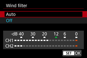 Pri nastavení na možnosť [Auto/Automaticky] sa potlačí skreslenie zvuku pri veterných scénach v exteriéri. Pri aktivovaní funkcie filtra proti vetru sa potlačí aj časť hlbokých basových zvukov.