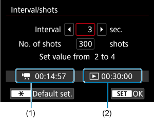 Uvádza čas potrebný na nasnímanie nastaveného počtu záberov s nastaveným intervalom. Ak prekročí 24 hodín, zobrazí sa položka „*** days“ (*** deň/dní).