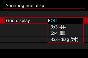 : Shooting info. disp./Zobrazenie informácií o snímaní] (, ).