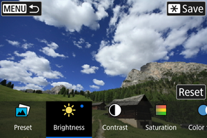 - Efekty ako [Brightness/Jas] alebo [Contrast/Kontrast] môžete vybrať pomocou tlačidla