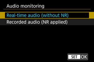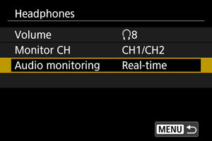 Počas nahrávania videozáznamu môžete zvoliť zvuk, ktorý sa použije vo výstupe slúchadiel. Ak chcete potlačiť šum pri nahrávaní zvuku, nakonfigurujte položku [Audio noise reduc./Potláčanie audio šumu] ().