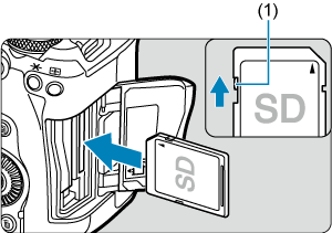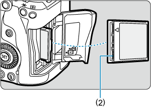 - Karta CFexpress: Ak štítok karty smeruje k vám, vložte otvorenú stranu karty (2) do otvoru na kartu. Nesprávne vloženie karty môže poškodiť fotoaparát.