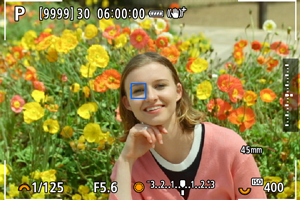 - Keď je objekt zaostrený, zobrazí sa bod AF (zelená pre Jednoobrázkový AF alebo modrá pre AF-Servo).