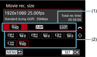 Môžete nastaviť rozlíšenie, snímkovú frekvenciu a spôsob kompresie v položke [: Movie rec. size/