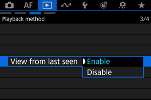 - [Enable/Povoliť]: Prehrávanie sa obnoví od poslednej zobrazenej snímky (okrem prípadu, keď ste práve dokončili snímanie).