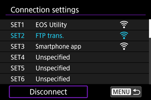Ak je nastavená možnosť [Enable/Povoliť] a po určitú dobu sa neprenesie žiadny obrázok, fotoaparát sa odhlási zo servera FTP a odpojí sa od siete LAN. Keď je fotoaparát znovu pripravený na prenos snímok, pripojenie sa automaticky obnoví. Ak ho nechcete odpojiť od siete LAN, nastavte možnosť [Disable/Zakázať].