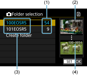 - Priečinky sú pomenované ako v „100EOSR5“, s trojciferným číslom priečinka, za ktorým nasleduje päť písmen alebo číslic. Priečinok môže obsahovať až 9999 snímok (čísla súborov 0001–9999). Keď sa priečinok zaplní, automaticky sa vytvorí nový priečinok s číslom o jedno väčším. Nový priečinok sa vytvorí aj v prípade ručného vynulovania (). Vytvoriť možno priečinky s číslami od 100 do 999.