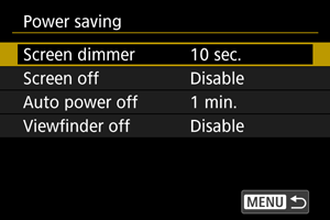 Môžete nastaviť časovanie stlmenia a následného vypnutia obrazovky, vypnutia fotoaparátu a vypnutia hľadáčika, keď necháte fotoaparát v nečinnosti (stlmenie obrazovky, vypnutie obrazovky, automatické vypnutie a vypnutie hľadáčika).