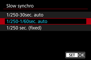- Synchronizácia s krátkymi časmi nie je k dispozícii v režime [P] alebo [Av] pri nastavení [1/250 sec. (fixed)/1/250 s (pevné nastavenie)].