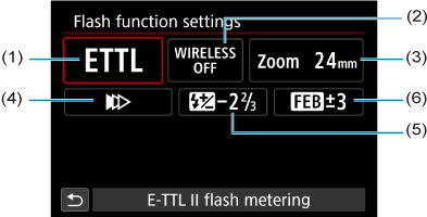 Informácie zobrazované na obrazovke, poloha zobrazenia a dostupné položky nastavenia sa môžu líšiť v závislosti od modelu blesku Speedlite, nastavenia užívateľských funkcií, režimu blesku a ďalších faktorov. Ďalšie informácie o funkciách blesku Speedlite nájdete v jeho návode na používanie.