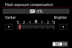 - Ak je kompenzácia expozície blesku nastavená pomocou blesku Speedlite, kompenzáciu expozície blesku nemožno nastaviť na fotoaparáte. Ak je nastavená pomocou fotoaparátu aj blesku Speedlite, nastavenie na blesku Speedlite bude mať prioritu pred nastavením na fotoaparáte.