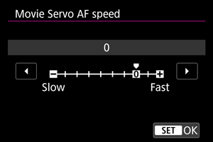 Môžete upraviť rýchlosť automatického zaostrenia (rýchlosť zmeny zaostrenia) zo štandardnej rýchlosti (0) na pomalú (jednu zo siedmich úrovní) alebo rýchlu (jednu z dvoch úrovní), aby ste dosiahli požadovaný efekt pri vytváraní videozáznamu.