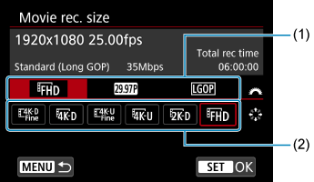 Môžete nastaviť rozlíšenie, snímkovú frekvenciu a spôsob kompresie v položke [: Movie rec. size/Veľkosť videozáznamu].