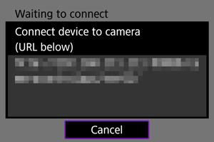 - Keď sa na fotoaparáte zobrazí vyššie uvedená obrazovka, použite smartfón, počítač alebo iné zariadenie na prístup k uvedenej adrese URL z aplikácie vyvinutej na ovládanie fotoaparátu.