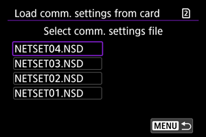 : Save/load cam settings on card/Uložiť/načítať nastavenia fotoap. na kartu] umožňuje uložiť všetky nastavenia komunikácie na fotoaparáte na kartu alebo načítať všetky nastavenia komunikácie pre iný fotoaparát z karty.
