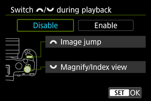 Ak chcete nastaviť, ako bude fotoaparát preskakovať medzi snímkami, môžete na obrazovke prehrávania v režime zobrazenia jednotlivých snímok otáčať voličom a súčasne stláčať tlačidlo priradené prvkom [