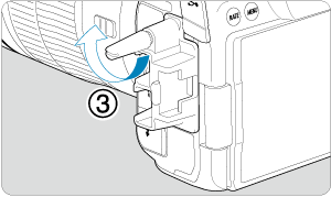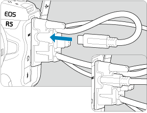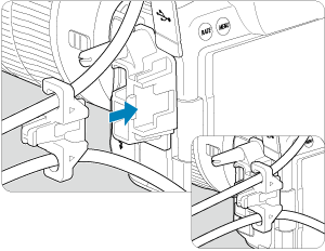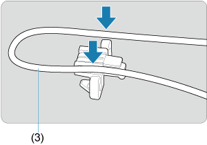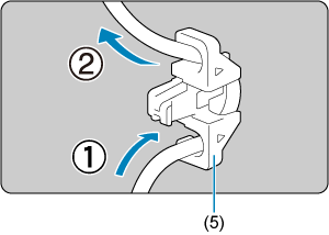 Če uporabljate izbirni Canonov vmesniški kabel, povlecite kabel skozi sponko (5), kot kaže slika, preden pritrdite sponko na ščitnik za kabel.
