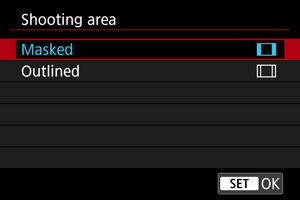 - Nastavitev [Shooting area/Območje fotografiranja] nima nobenega učinka na prikaz, če je nastavljeno [1.6x (crop)/1,6x (izrez)] ali pri fotografiranju z objektivi RF-S ali EF-S.