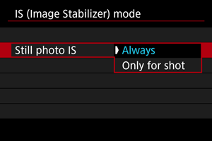 Izberite [Still photo IS/IS za fotografijo].
