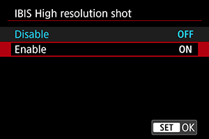 - Možnost [IBIS High resolution shot/Visoko ločljivostno fotografiranje IBIS] se vrne v stanje [Disable/Onemogoči], če vklopno stikalo nastavite na