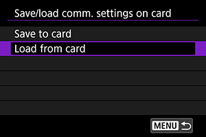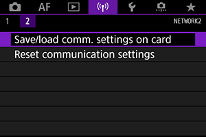 : Shranjevanje/prenos nastavitev fotoaparata na kartico] omogoča, da shranite vse nastavitve komuniciranja v fotoaparatu na kartico ali jih s kartice prenesete v drug fotoaparat.