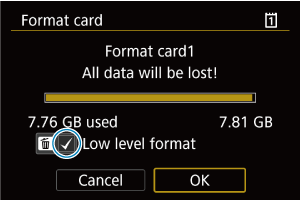 - Med formatiranjem na osnovnem nivoju lahko prekličete formatiranje z izbiro [Cancel/Preklic]. Tudi v tem primeru bo normalno formatiranje izvedeno in kartico boste lahko uporabljali kot običajno.