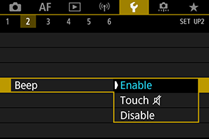 Onemogoči zvočne signale za potrditev izostritve, fotografiranje s samosprožilcem in postopke upravljanja z dotikom.