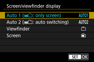 - Med prikazom v iskalu in na zaslonu lahko preklopite tudi s pritiskom na gumb, ki ste ga prilagodili z dodelitvijo možnosti preklopa. S to nastavitvijo nastavljeno na [AUTO1/SAMODEJNO1] ali [AUTO2/SAMODEJNO2] se fotoaparat ustrezno odziva na tipalo za oko.
