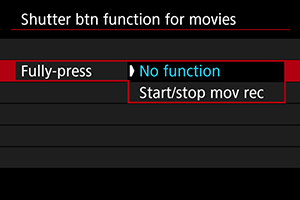 Če nastavite možnost [Fully-press/Pritisk do konca] na [Start/stop mov rec/Začetek/konec snemanja filma], lahko začnete/prenehate snemati film ne samo z gumbom za snemanje filma, temveč tudi s pritiskom gumba zaklopa do konca ali z uporabo daljinskega stikala RS-60E3 (v prodaji posebej).