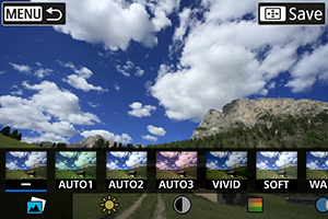 lahko izberete [VIVID/ŽIVO], [SOFT/MEHKO] ali druge prednastavljene učinke. Na osnovi nastavitev pogojev in narave slike v fotoaparatu so priporočeni učinki [AUTO1/SAMODEJNO1], [AUTO2/SAMODEJNO2] in [AUTO3/SAMODEJNO3].