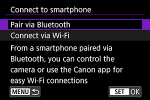 - Fotoaparata ne morete prek Bluetootha hkrati povezati z dvema ali več napravami. Za preklop na drug pametni telefon za vzpostavitev povezave Bluetooth poiščite napotke v Ponovna povezava prek Wi-Fi/Bluetooth.
