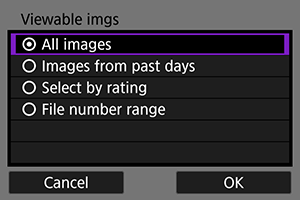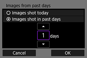 - Če izberete [Images shot in past days/Zajete slike v preteklih dneh], bodo za pregledovanje izbrane slike, zajete od trenutnega datuma do dneva, ki se sklada z izbranim številom dni pred današnjim datumom. S pomočjo regulatorja
