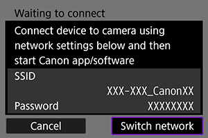 - Na nastavitvenem zaslonu za Wi-Fi na pametnem telefonu se dotaknite SSID (ime omrežja), ki je prikazano na fotoaparatu, nato vpišite geslo za dostopno točko za vzpostavitev povezave.