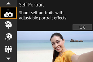 Za fotografiranje samega sebe uporabite način [] (Self Portrait/Avtoportret). Zavrtite zaslon naokoli proti objektivu. Prilagodljiva obdelava slike vsebuje funkcijo glajenja kože kot tudi prilagoditev svetlosti in ozadja, tako da na posnetku portret izstopa.