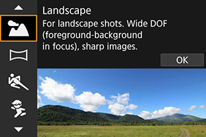 Uporabite način [] (Landscape/Pokrajina) za zajem širokega pokrajinskega prizora ali za izostritev celotnega predela od spredaj do ozadja v daljavi. Za žive in polne zelene in modre odtenke in zelo ostre in čiste posnetke.