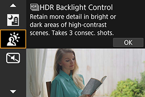 Nadzor osvetlitve iz ozadja HDR) uporabljajte za prizore s svetlimi in temnimi predeli, ki so osvetljeni iz ozadja. Z enim zajemom v tem načinu so zajete tri zaporedne slike z različnimi ekspozicijami, ki so združene v eno samo sliko HDR z ohranjenimi podrobnostmi v senčnih območjih, ki bi bile drugače zaradi osvetljenega ozadja izgubljene.