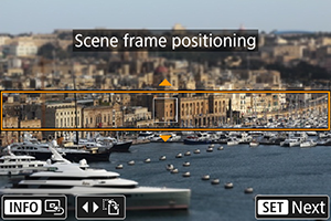 Za premik območja, ki je izostreno (okvir učinka miniature) glejte navodila Prilagajanje učinka miniature. Funkcija [1-point AF/1-točkovno AF] je v uporabi kot območje za AF. Priporočamo fotografiranje s poravnanima točko AF in okvirjem s prizorom.